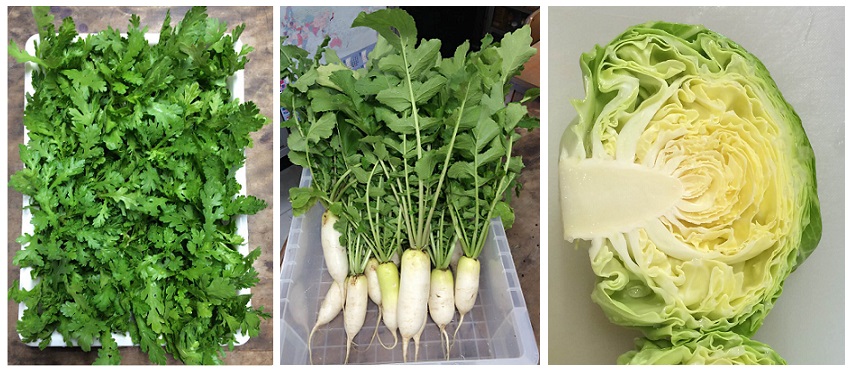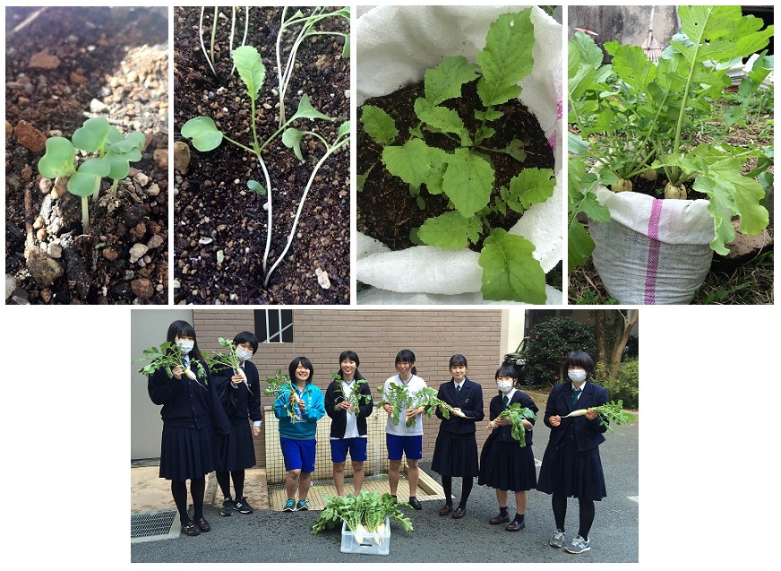 一連の取り組みを応援してくださる花の業者さんから苗をいただき、予定外にも栽培することになりました。栽培中は、苗に話しかけるとよく育つ等の知識を出し合ったり、青虫を殺さずに取り除く男子生徒諸君の姿に心が和んだものです。日当たりのいいプール横に畝を作り、青虫と日々格闘すること約2か月。まだ小ぶりですが、柔らかい葉がしっかり巻かれたものを収穫することができました。