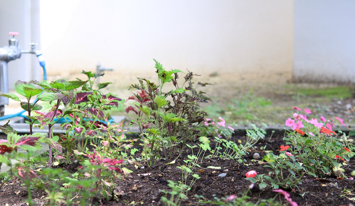 ここでは現在、コリウス・インパチェンス・ホウセンカを育てています。観葉植物のコリウスは種類が豊富で、葉の色や模様が個性的です。日照不足な場所でも大きく育つインパチェンスは、イチョウの木の下の花壇では頼りになる存在です。ホウセンカは乾燥を嫌うことから、ジメジメしやすいこの場所でうまく育つことを祈りながら種を植え、経過観察中です。優しげな雰囲気だった春の花壇とはまた違う、どこかエキゾチックな雰囲気のある花壇を楽しんでもらえたら嬉しいです。